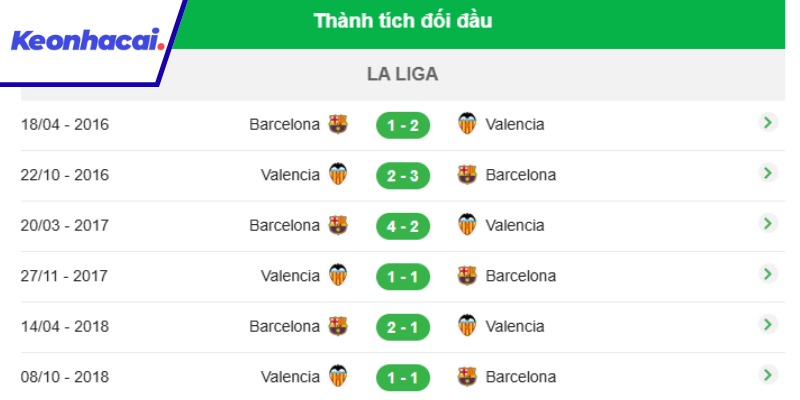 Lịch sử chạm trán giữa Barcelona và Valencia những trận gần nhất