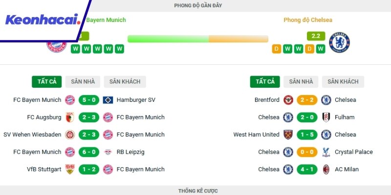 | Kèo Tài Xỉu | Tài 2.75 | Bayern có hàng công cực kỳ mạnh mẽ và khả năng ghi bàn luôn hiện hữu. Tuy nhiên, Chelsea có thể gây khó khăn với lối chơi phòng ngự chặt chẽ. |