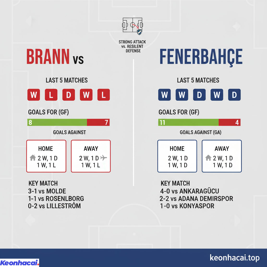 Tổng quan, Brann đang thể hiện sự vững chắc, đặc biệt là khi thi đấu trên sân nhà, nơi họ đã có những chiến thắng thuyết phục. Hàng thủ của họ là một điểm tựa vững chắc, trong khi hàng công biết cách tận dụng cơ hội. Ngược lại, Fenerbahce sở hữu một đội hình giàu kinh nghiệm và cá nhân xuất sắc hơn, nhưng phong độ trên sân khách của họ lại khá bất ổn. Yếu tố sân bãi sẽ đóng vai trò quan trọng trong cuộc đụng độ này.