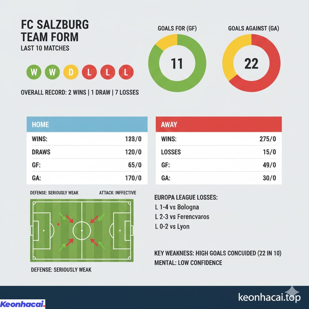 Salzburg chỉ có vỏn vẹn 2 chiến thắng, 1 trận hòa và nhận đến 7 thất bại trong 10 trận gần nhất. Đáng chú ý, họ thường xuyên để thủng lưới với số lượng lớn trong các trận đấu tại cúp châu Âu, ví dụ như thua 1-4 trước Bologna, 2-3 trước Ferencvaros hay 2-0 trước Lyon. Tổng cộng, họ đã để lọt lưới 22 bàn trong 10 trận này, cho thấy hàng phòng ngự đang gặp vấn đề nghiêm trọng.