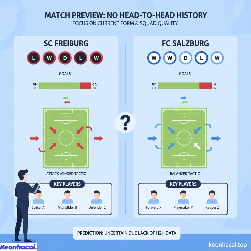 Theo dữ liệu được cung cấp, không có thông tin về lịch sử đối đầu trực tiếp giữa Freiburg và Salzburg trong quá khứ gần đây. Điều này có nghĩa là cả hai đội sẽ bước vào trận đấu với ít hoặc không có kinh nghiệm đối đầu trực tiếp với nhau.