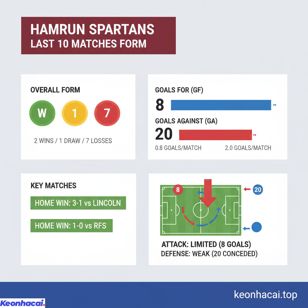 Trong 10 trận đấu gần nhất, Hamrun Spartans chỉ giành được 2 chiến thắng, 1 trận hòa và để thua tới 7 trận. Điều này cho thấy sự yếu kém rõ rệt về mặt phong độ, đặc biệt là khi đối đầu với các đội bóng mạnh hơn ở các giải đấu lớn như Europa League hay Champions League. Khả năng ghi bàn của Hamrun Spartans khá hạn chế, với chỉ 8 bàn thắng trong 10 trận (trung bình 0.8 bàn/trận), trong khi hàng thủ lại tỏ ra lỏng lẻo khi để thủng lưới đến 20 bàn (trung bình 2 bàn/trận). Dù có những điểm sáng nhỏ khi chơi trên sân nhà như trận thắng Lincoln 3-1 hay RFS 1-0, nhưng nhìn chung, Hamrun Spartans vẫn còn nhiều việc phải làm để cải thiện lối chơi và kết quả.