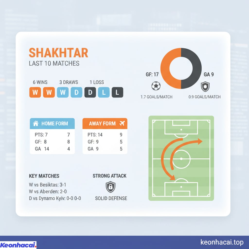 Shakhtar đã thể hiện một sức mạnh đáng gờm với 6 chiến thắng, 3 trận hòa và chỉ vỏn vẹn 1 thất bại trong 10 trận gần nhất. Đội bóng này cho thấy sự hiệu quả trong tấn công khi ghi được 17 bàn (trung bình 1.7 bàn/trận) và sự chắc chắn ở hàng phòng ngự với chỉ 9 bàn thua (trung bình 0.9 bàn/trận). Họ thường xuyên giành chiến thắng trên sân khách với những tỷ số khá ấn tượng. Những trận hòa không bàn thắng cho thấy khả năng phòng ngự kiên cường khi cần thiết, trong khi các chiến thắng thuyết phục trước Besiktas hay Aberdeen chứng tỏ sức mạnh tấn công đa dạng. Soi kèo Skendija vs Slovan cũng cho thấy tầm quan trọng của việc phân tích chuỗi trận không thua để đánh giá sự tự tin của đội bóng.